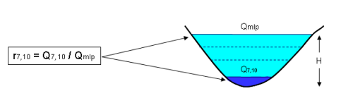 A relação entre a disponibilidade hídrica máxima representada pela vazão média, e a vazão mínima de estiagem é um indicador da necessidade de regularização natural de um curso de água. Este indicador, denominado nesse estudo, como índice de vazão mínima de sete dias de duração e período de retorno de 10 anos (r7,10 = Q7,10 /Qmlp), depende da capacidade de regularização natural do curso de água, ou seja, quanto menor este índice maior a variação de vazão durante os períodos de estiagens, com baixa capacidade de regularização natural (Figura 1).